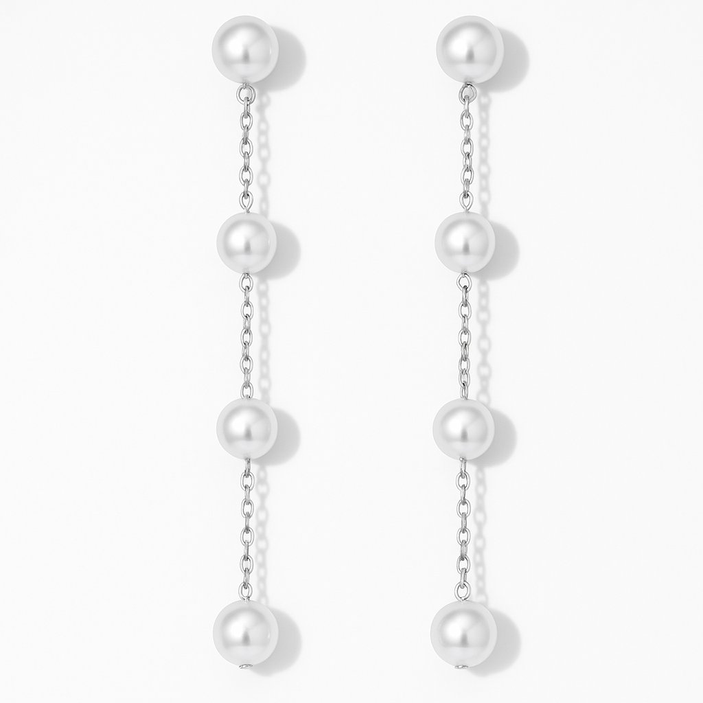 Tyto dlouhé náušnice s pravidelně rozmístěnými perličkami na jemném řetízku jsou ideální volbou pro slavnostní příležitosti i jako doplněk k elegantnímu outfitu. Díky kombinaci decentního třpytu a klasického designu působí velmi žensky a stylově. Bílé perličky krásně odrážejí světlo a dodávají šperku jemný lesk.
