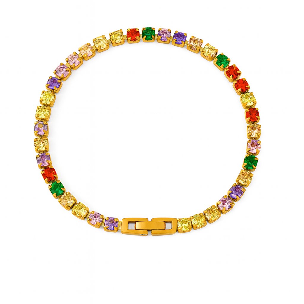 Tento elegantní náramek přináší radost a barvy do vaší šperkovnice. Vyrobený z odolné chirurgické oceli ve zlatém tónu, osazený jemně broušenými zirkony v různých barvách. Náramek působí luxusně a díky decentnímu třpytu zirkonů se stane výrazným doplňkem každého outfitu – ať už slavnostního nebo ležérního. Skvělý tip na dárek!