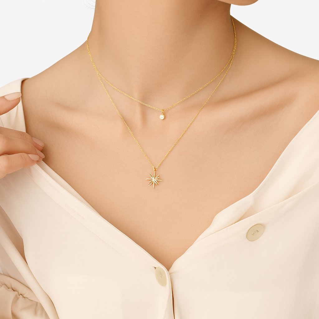 Tento sofistikovaný dvouvrstvý náhrdelník ve zlatém tónu je tvořen dvěma jemnými řetízky – kratší s drobným zirkonem a delší s přívěskem ve tvaru hvězdy. Díky své lehkosti a jemnosti je ideální volbou pro každodenní nošení i pro slavnostnější příležitosti. Skvěle doplní outfit v přírodních nebo pastelových tónech.
