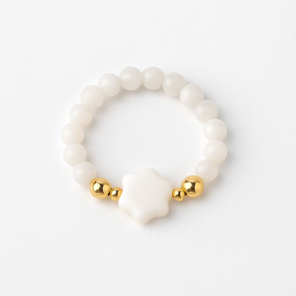 Minimalistický, ale výjimečný. Tento elastický prstýnek je tvořen drobnými bílými perličkami a zlatými detaily, které doplňuje roztomilý květinový motiv. Díky pružnému provedení se přizpůsobí většině velikostí prstů a je ideální pro každodenní nošení i vrstvení s jinými prsteny. Skvělý doplněk pro jemný a elegantní vzhled.