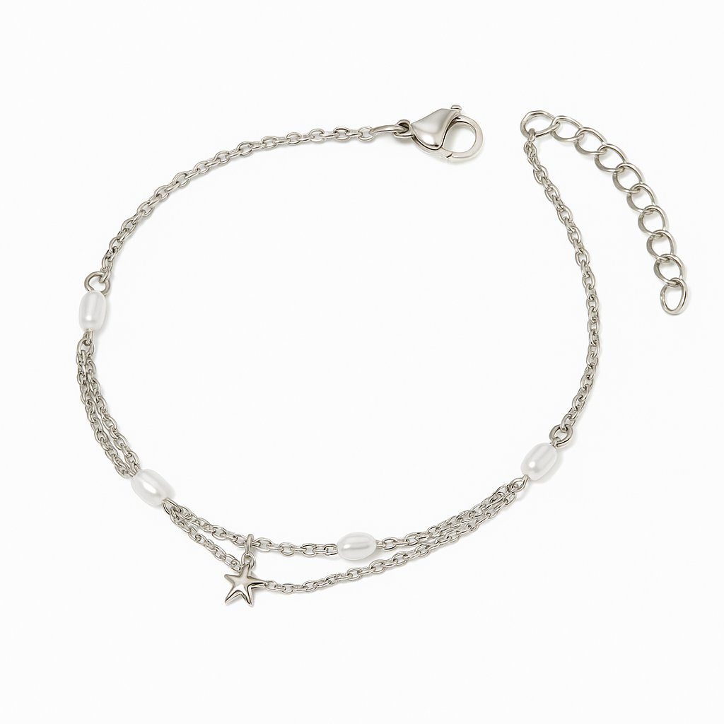 Objevte kouzlo jednoduché elegance s tímto jemným náramkem s perličkami a přívěskem hvězdy ve stříbrném tónu. Dvojitý řetízek dodává šperku jemnou vrstvu luxusu a díky perličkám působí romanticky i sofistikovaně. Skvěle se hodí jak na každodenní nošení, tak i pro speciální příležitosti. Nastavitelná délka zajistí pohodlné nošení pro každé zápěstí.