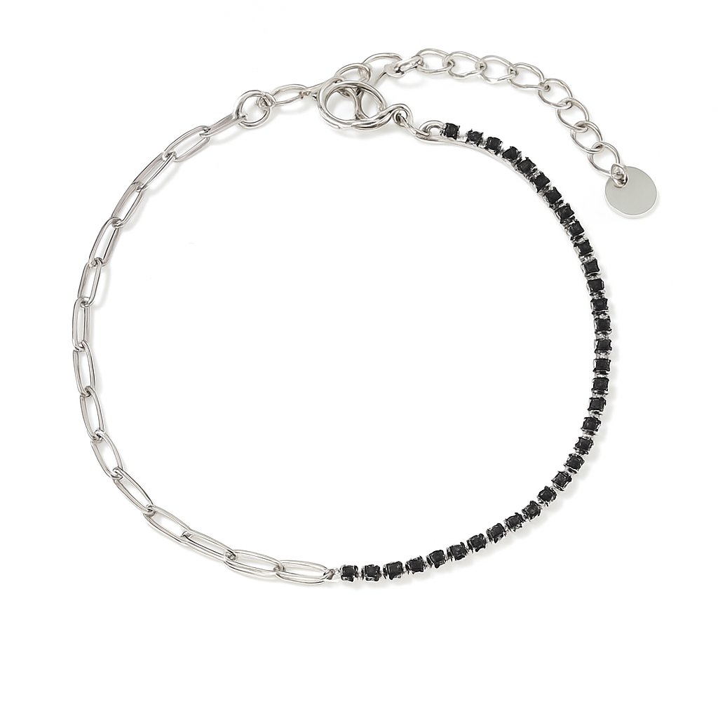 Dodejte svému letnímu outfitu stylový detail s tímto elegantním řetízkem na nohu ve stříbrném tónu. Design kombinuje moderní řetízkovou strukturu s jemně třpytivými černými kamínky, které vytvářejí výrazný kontrast. Perfektní doplněk k sandálům nebo naboso.