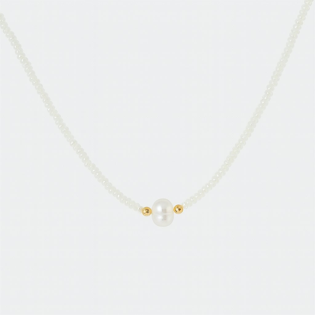 Elegantní a jemný náhrdelník, který spojuje jednoduchost s přirozenou krásou perel. Náhrdelník je tvořen řadou drobných bílých korálků, které lemují centrální sladkovodní perlu, doplněnou o dva zlaté kovové akcenty. Tato kombinace vytváří sofistikovaný a zároveň přirozený vzhled, ideální pro každodenní nošení i speciální příležitosti.