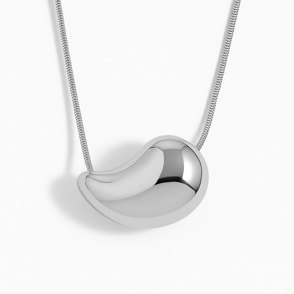 Doplňte svůj styl tímto výrazným náhrdelníkem s přívěskem ve stříbrném tónu, který vyniká organickým tvarem a hladkým lesklým povrchem. Tento design je inspirovaný současnými minimalistickými trendy, ale zároveň přináší odvážný a umělecký prvek. Náhrdelník se hodí ke každodennímu nošení i jako stylový doplněk k večerním outfitům. Díky svému jemnému řetízku a lesklému přívěsku se stává univerzálním kouskem, který zaujme na první pohled.