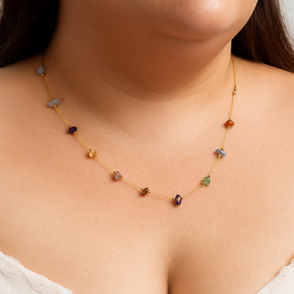 Náhrdelník Amélie je ztělesněním jemnosti a ženskosti. Kombinuje drobné kamínky v pastelových barvách s tenkým zlatým řetízkem, který krásně ladí s teplými tóny pleti. Tento doplněk působí svěže, romanticky a dokonale se hodí k jarním i letním outfitům.