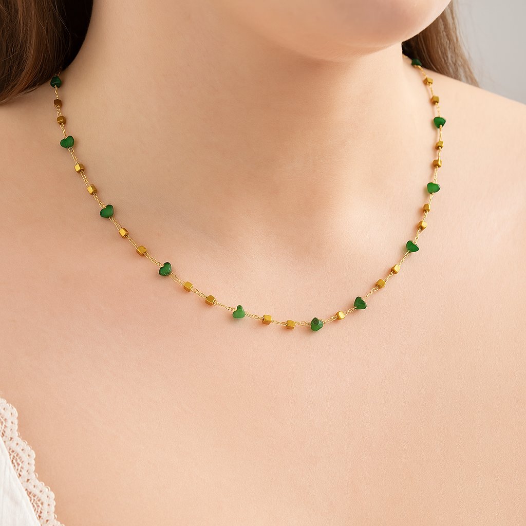 Eliana je náhrdelník, který zaujme svou nadčasovou elegancí. Smaragdově zelené kamínky na jemném zlatém řetízku vytvářejí působivý kontrast a přinášejí pocit klidu a sebevědomí. Tento šperk se skvěle hodí pro ženy, které preferují elegantní styl s přírodním nádechem.