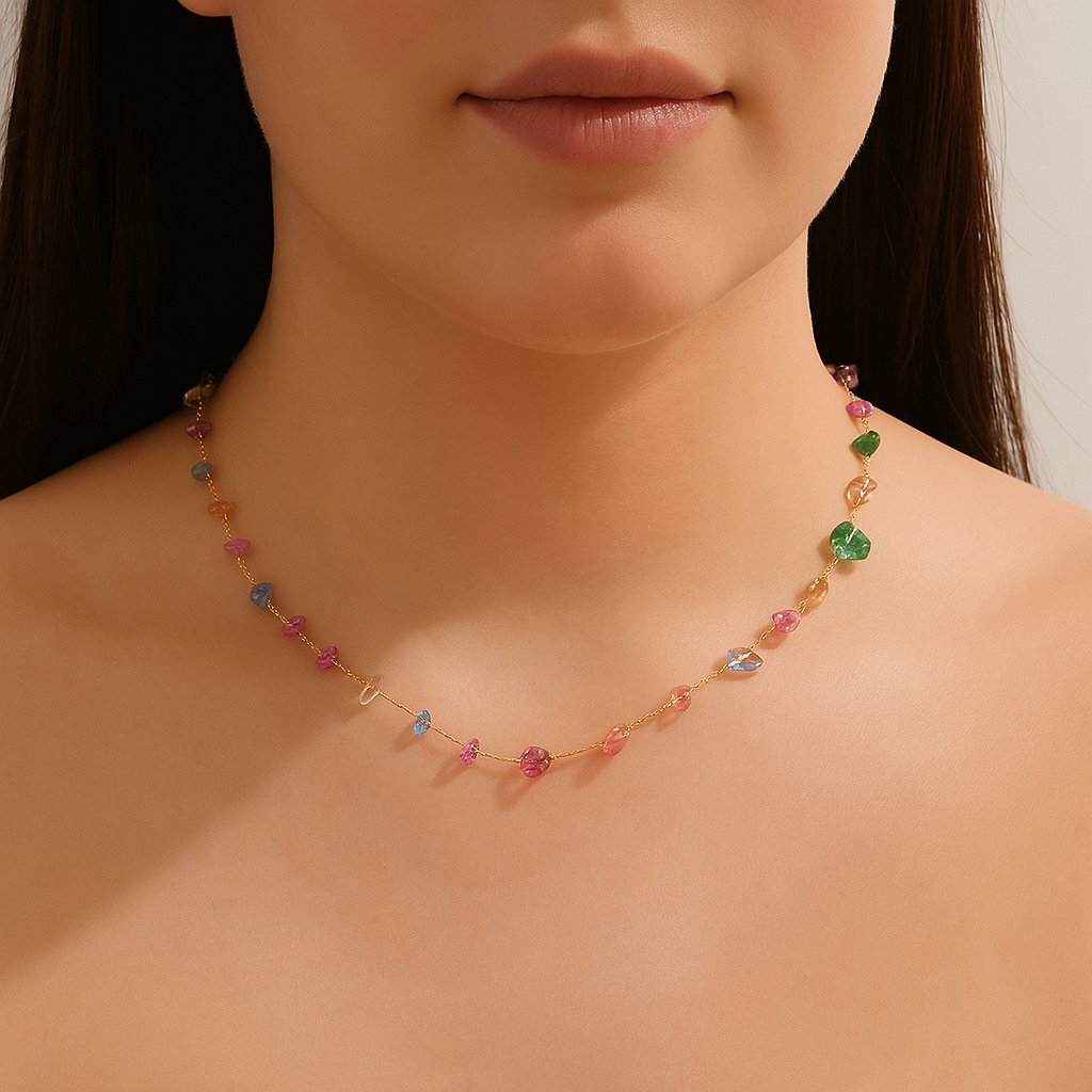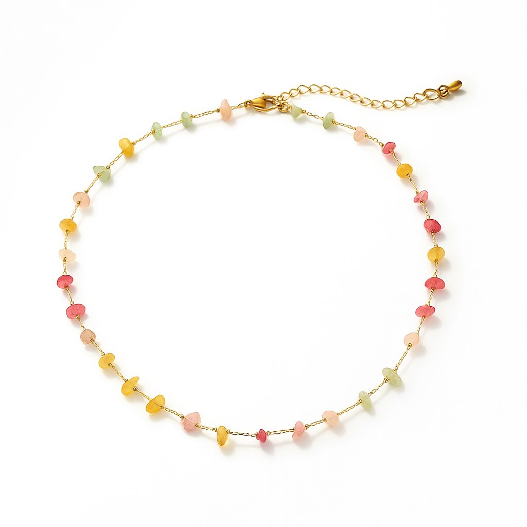Tento nádherný náhrdelník kombinuje jemnost zlatého řetízku s barevným akcentem drobných kamínků v různých odstínech – od růžové přes zelenou až po jantarovou. Díky svému decentnímu designu se hodí jak k ležérnímu outfitu, tak k elegantním šatům. Náhrdelník je dostupný ve více barevných variantách takže si můžete vybrat styl, který nejlépe vyjadřuje vaši osobnost. Nastavitelná délka umožňuje dokonalé přizpůsobení.