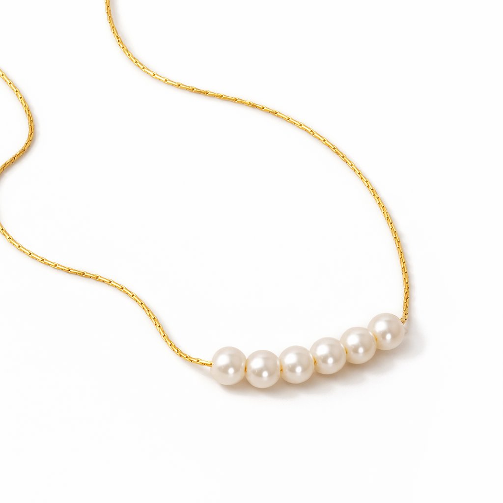 Minimalistický náhrdelník s řadou perel je přesně tím kouskem, který decentně podtrhne vaši ženskost. Jemný zlatý řetízek doplněný hladkými perlami působí čistě, elegantně a velmi vkusně. Skvěle se kombinuje s dalšími šperky, ale obstojí i jako samostatný doplněk.