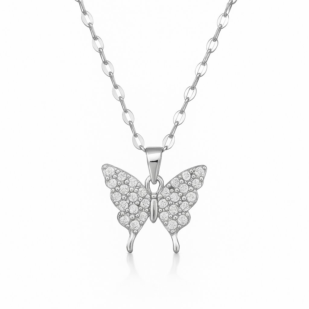 Náhrdelník s přívěskem motýla zdobeným zirkony ve stříbrném tónu S1236