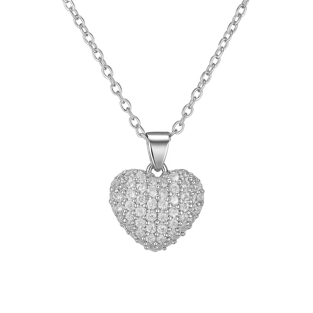 Zářivý náhrdelník se srdcovým přívěskem, který je hustě osázen třpytivými čirými zirkony. Je ideálním doplňkem pro romantické příležitosti, slavnostní večery nebo jako dárek z lásky. Stříbrný odstín dodává šperku nadčasovou eleganci, kterou snadno zkombinujete s jakýmkoli outfitem.