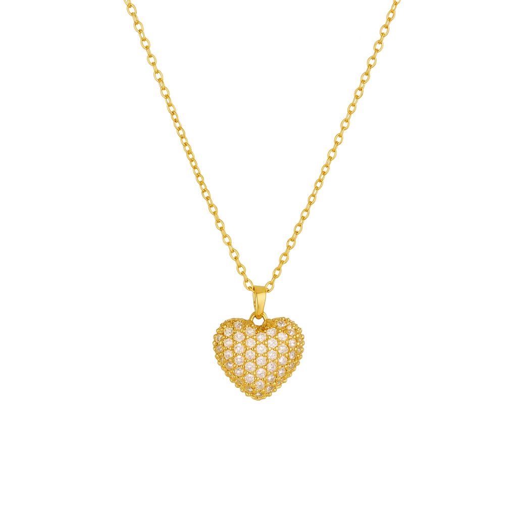 Tento oslnivý náhrdelník se srdcovým přívěskem bohatě zdobeným čirými zirkony je dokonalým šperkem pro každou ženu, která miluje jemný lesk a romantický design. Zlatý tón přidává náhrdelníku luxusní vzhled a působivě doplní jak denní, tak večerní outfit.