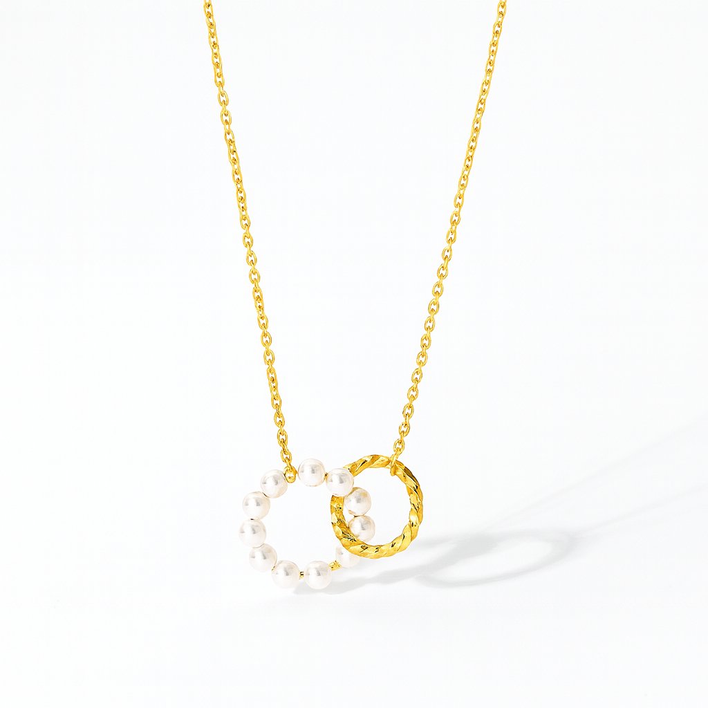 Tento jemný náhrdelník s propojenými kroužky představuje harmonii kontrastů – zlatý kroužek s texturou a druhý zdobený drobnými perlami. Ideální volba pro každodenní nošení i speciální příležitosti. Dodává šmrnc jakémukoli outfitu.