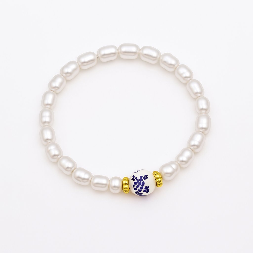 Nádherný náramek kombinující klasickou krásu perel a jemnost porcelánu. Elastický náramek je tvořen lesklými syntetickými perlami v nepravidelném tvaru, které dodávají šperku přirozený vzhled. Dominantou je ručně malovaný porcelánový korálek s modrým květinovým motivem, doplněný dvěma drobnými zlatými mezikorálky pro luxusní dotek.