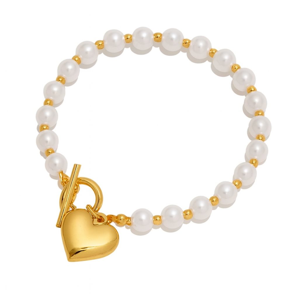 Tento jemný náramek spojuje klasickou krásu perel s moderním zlatým srdcem a originálním T-zapínáním. Perličky jsou navlečené na pevné šňůrce a oddělené drobnými zlatými kuličkami. Ideální doplněk pro každodenní nošení i slavnostní příležitosti. Náramek z chirurgické oceli je hypoalergenní a odolný vůči opotřebení.