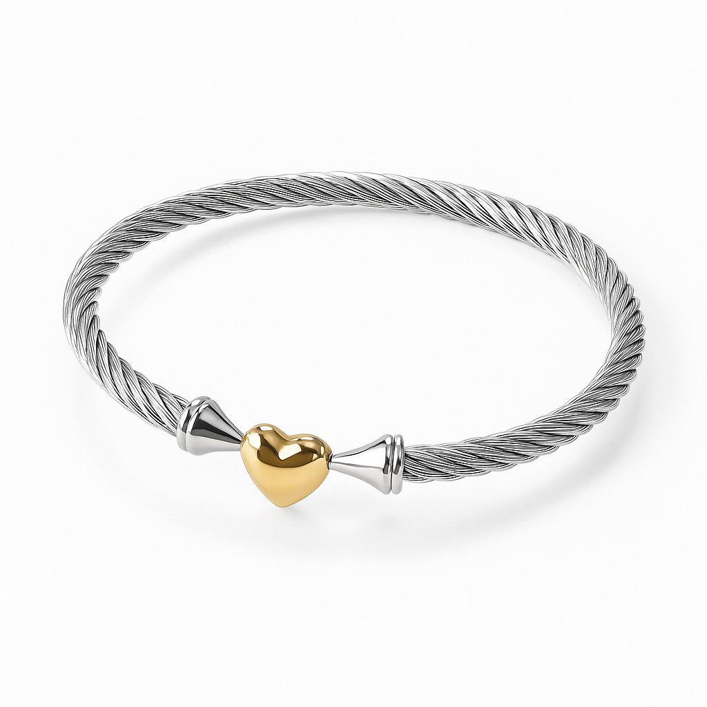 Moderní a elegantní náramek, který zaujme svým krouceným vzhledem a lesklým srdíčkem ve zlatém tónu. Díky otevřené konstrukci se snadno nasazuje a pohodlně nosí. Kombinace stříbrné oceli a zlatého detailu vytváří atraktivní kontrast, který se hodí ke každému outfitu. Ideální jako stylový doplněk i jako dárek pro milovanou osobu.