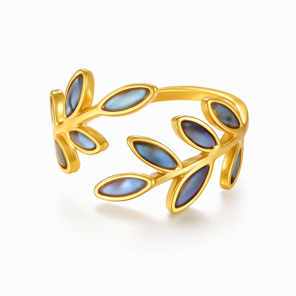 Tento jemně zpracovaný prsten v designu větvičky s perleťově zdobenými lístky je výrazným doplňkem pro každou příležitost. Kombinace zlaceného povrchu a lesklé perleti působí velmi sofistikovaně.