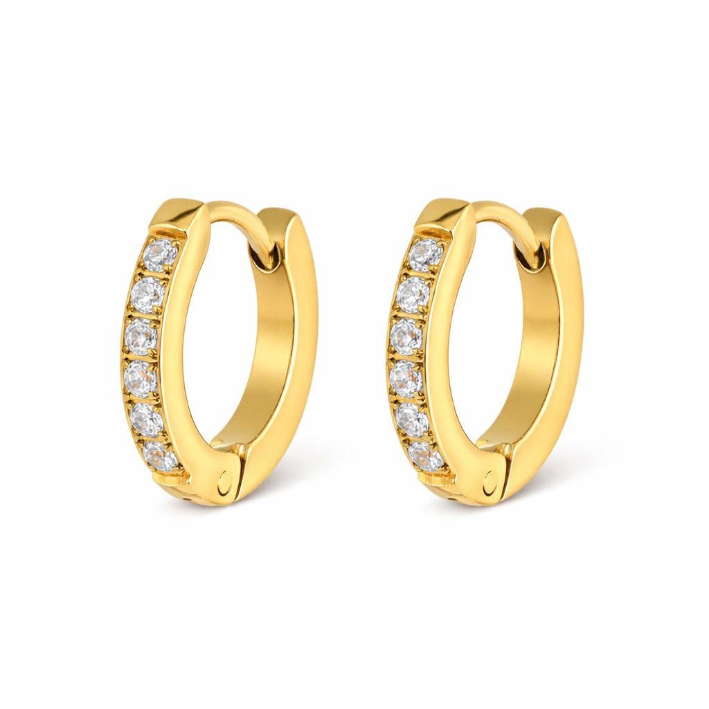 Tyto jemné kruhové náušnice ve zlatém tónu jsou nadčasovým doplňkem, který dodá vašemu outfitu decentní lesk. Přední strana je osazena čirými zirkony, které krásně odrážejí světlo a působí elegantně, ale zároveň nenápadně. Díky praktickému zapínání perfektně drží na uchu a jsou pohodlné i při celodenním nošení.