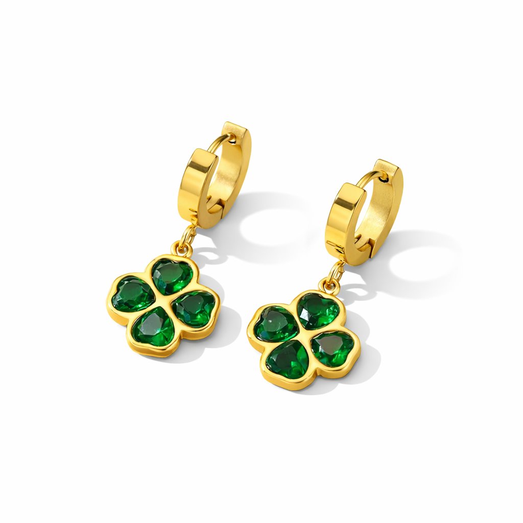 Tyto stylové náušnice ve zlatém tónu zaujmou originálním motivem čtyřlístku, který je osazen zelenými zirkony s krásným leskem. Jemný závěsný design působí elegantně a zároveň moderně, díky čemuž jsou náušnice ideální jak pro každodenní nošení, tak pro slavnostnější příležitosti. Zapínání na kloub zajišťuje pohodlné a bezpečné nošení. Náušnice jsou vyrobeny z kvalitního materiálu, který je vhodný i pro citlivější pokožku. Perfektní volba pro ženy, které mají rády symboliku, eleganci a nadčasový styl.