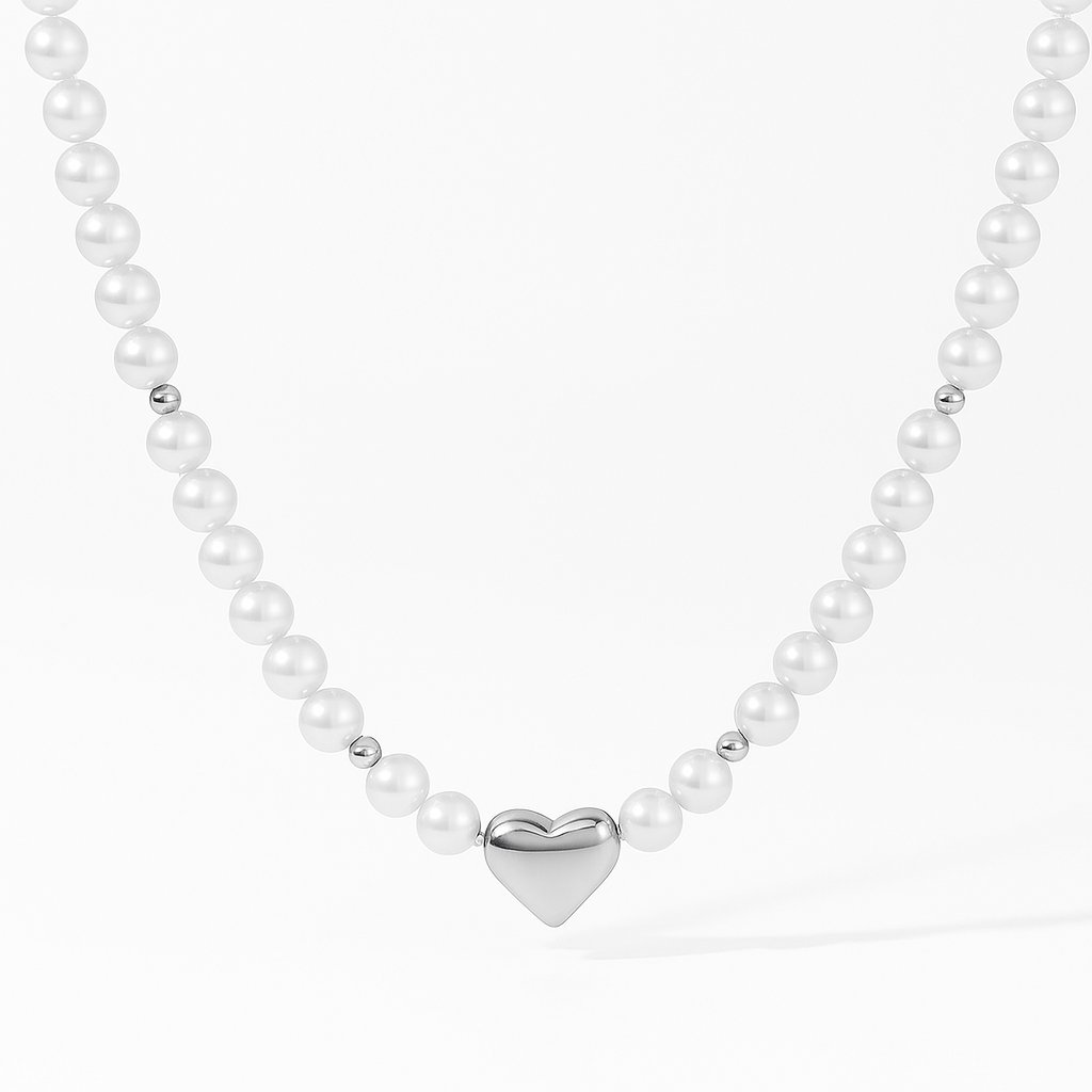 Vnes do svého outfitu elegantní nádech s tímto perlovým náhrdelníkem. Lesklé skleněné perly jsou proloženy drobnými korálky z chirurgické oceli a ve středu je zdobí hladký srdíčkový přívěsek. Minimalistický design podtrhuje ženskost a působí luxusně jak v běžný den, tak při slavnostních chvílích.