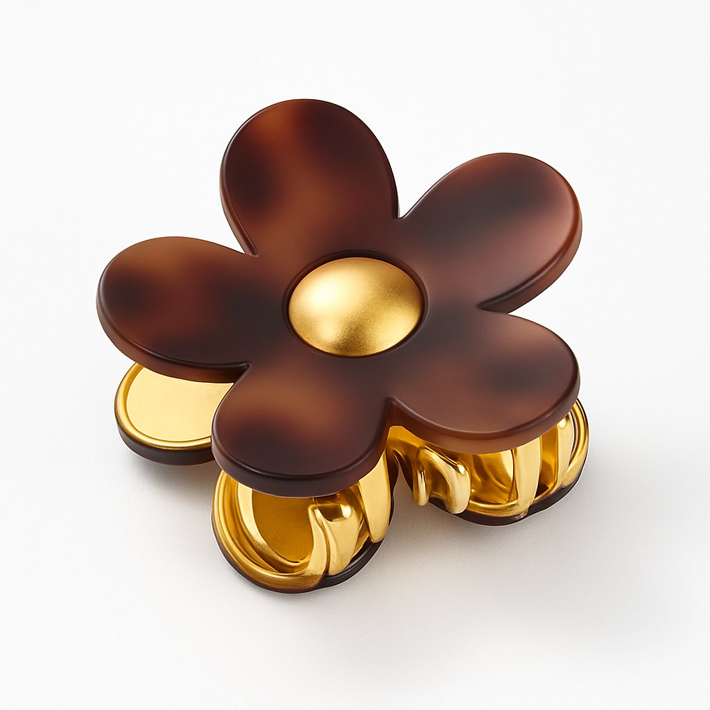 Stylová vlasová spona ve tvaru květu v kombinaci hnědé a zlaté barvy je nejen praktickým pomocníkem, ale i designovým doplňkem. Robustní kovový mechanismus zajistí pevné uchycení vlasů bez sklouzávání. Ideální pro elegantní účesy i rychlé sepnutí vlasů během dne. Krásný doplněk pro každodenní nošení i slavnostní příležitosti.