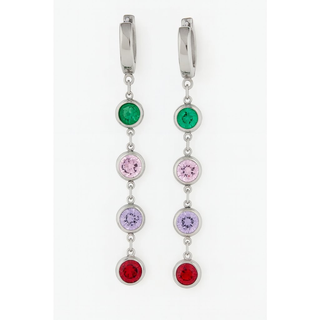 Dopřejte si jemný třpyt a hravou barevnost s těmito stříbrnými náušnicemi osazenými pěti kulatými zirkony v odstínech zelené, růžové, fialové a červené. Náušnice vynikají svým elegantním designem a decentním pohybem při nošení. Skvěle doplní váš outfit při každodenním nošení i na večerní příležitosti.