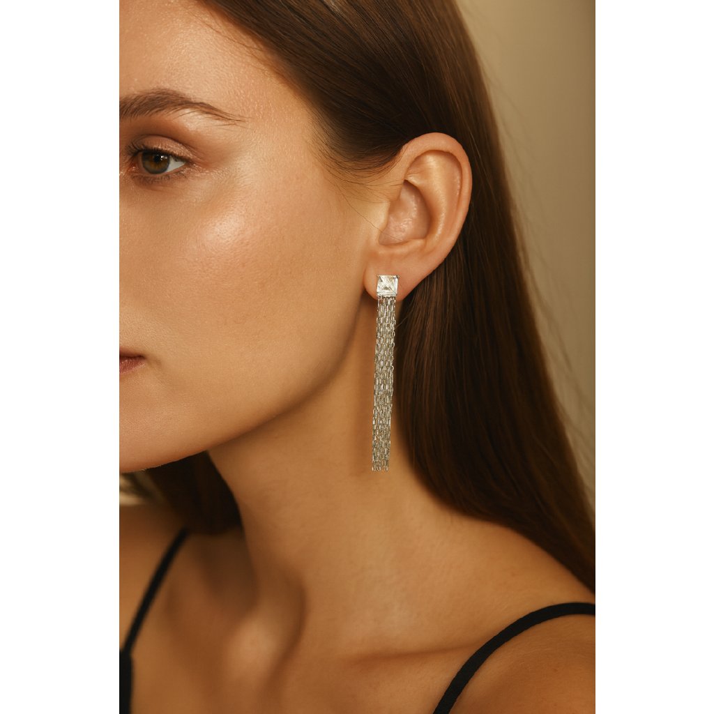 Tyto luxusní visací náušnice z chirurgické oceli jsou zdobeny čirým obdélníkovým zirkonem, který nádherně odráží světlo. Zirkon je upevněn na vrchní části náušnice a z něj volně visí několik jemných řetízků, které dodávají šperku pohyb, třpyt a eleganci. Jsou ideální na večerní nošení, ale také jako decentní doplněk ke každodennímu outfitu.