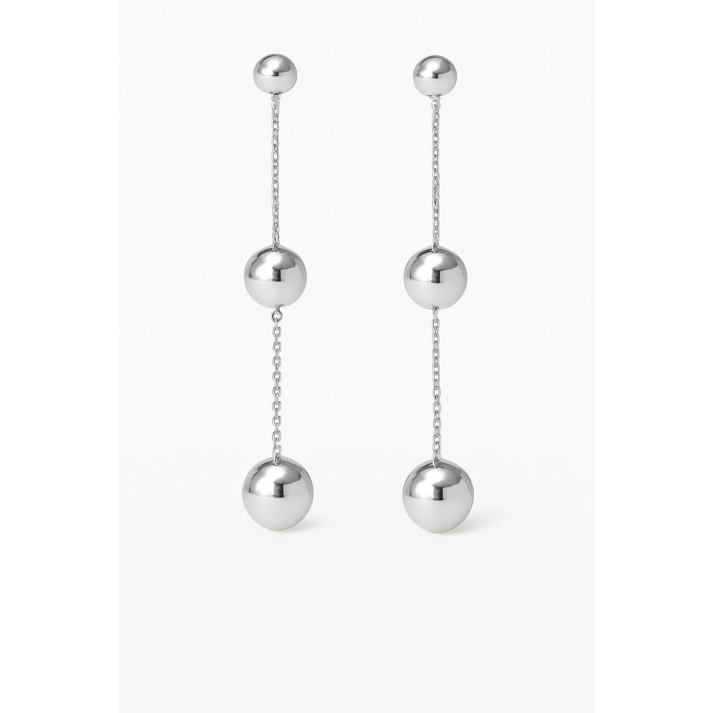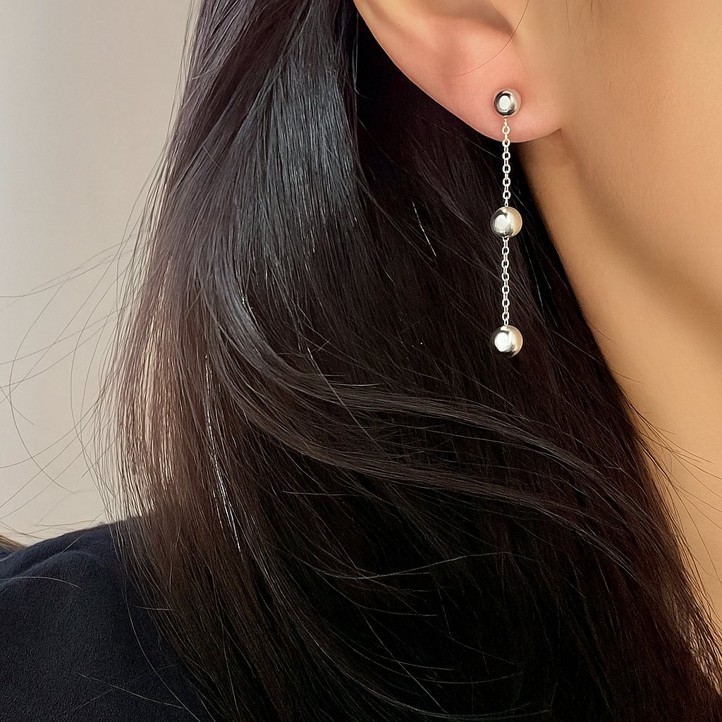 Objevte jednoduchost a eleganci ve stříbrné barvě s těmito visacími náušnicemi. Tři lesklé kuličky na jemném řetízku tvoří minimalistický a přitom poutavý šperk. Ideální volba pro každodenní outfit i večerní události.