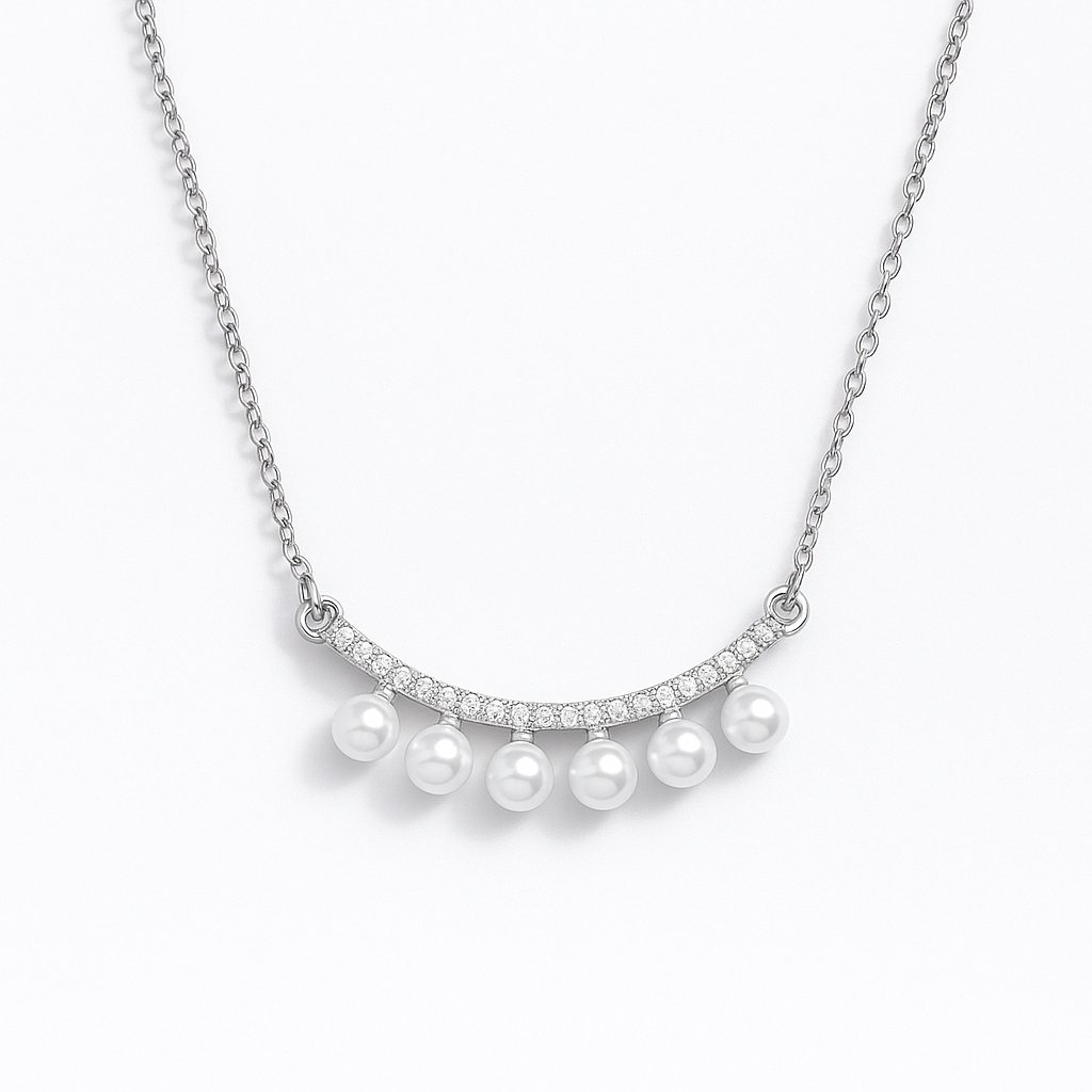 Elegantní stříbrný náhrdelník kombinuje lesk perel a jemný třpyt zirkonů, zasazených do půvabného zakřiveného přívěsku. Jemný řetízek podtrhuje decentní design, který se hodí ke každodennímu outfitu i na slavnostní příležitosti. Ideální dárek pro ženu, která miluje jemné, ale výrazné šperky.