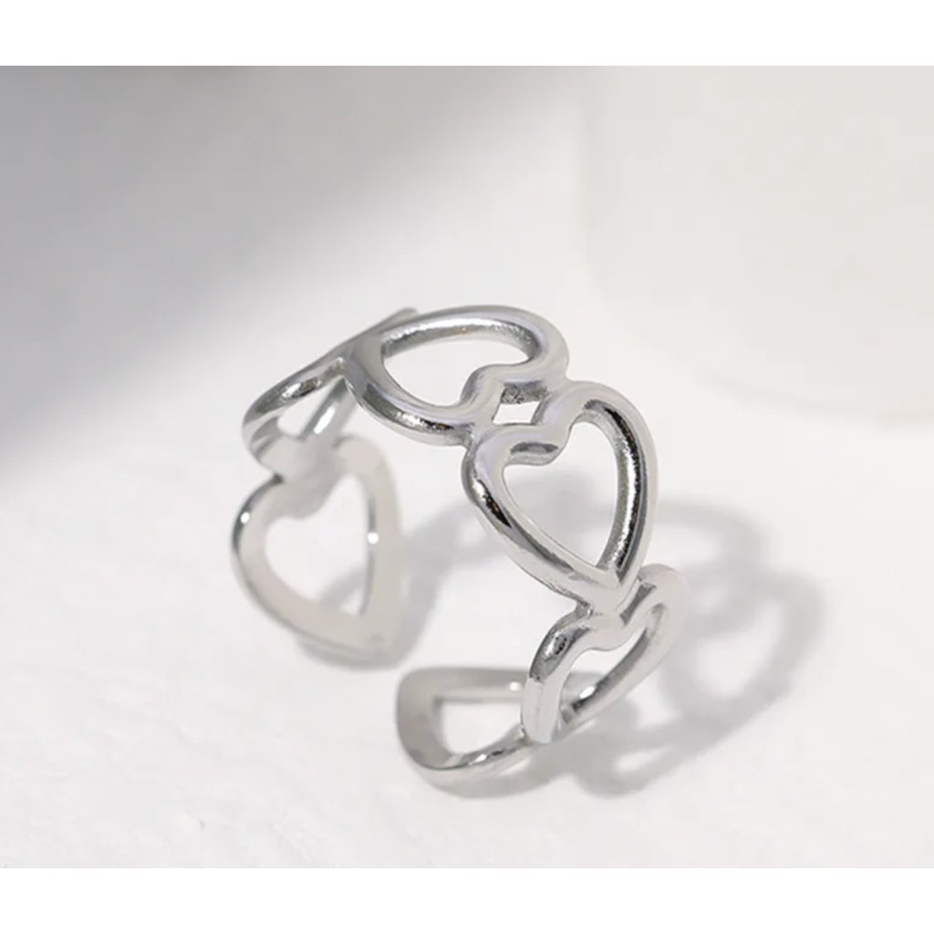 Elegantní prsten s otevřeným designem tvořeným jemnými obrysy srdcí je symbolem lásky, blízkosti a emocí. Díky nastavitelnému provedení se pohodlně přizpůsobí prstu a je ideální pro každodenní nošení. Minimalistický, ale výrazný doplněk, který se krásně kombinuje s dalšími šperky a hodí se pro ženy všech věkových kategorií.