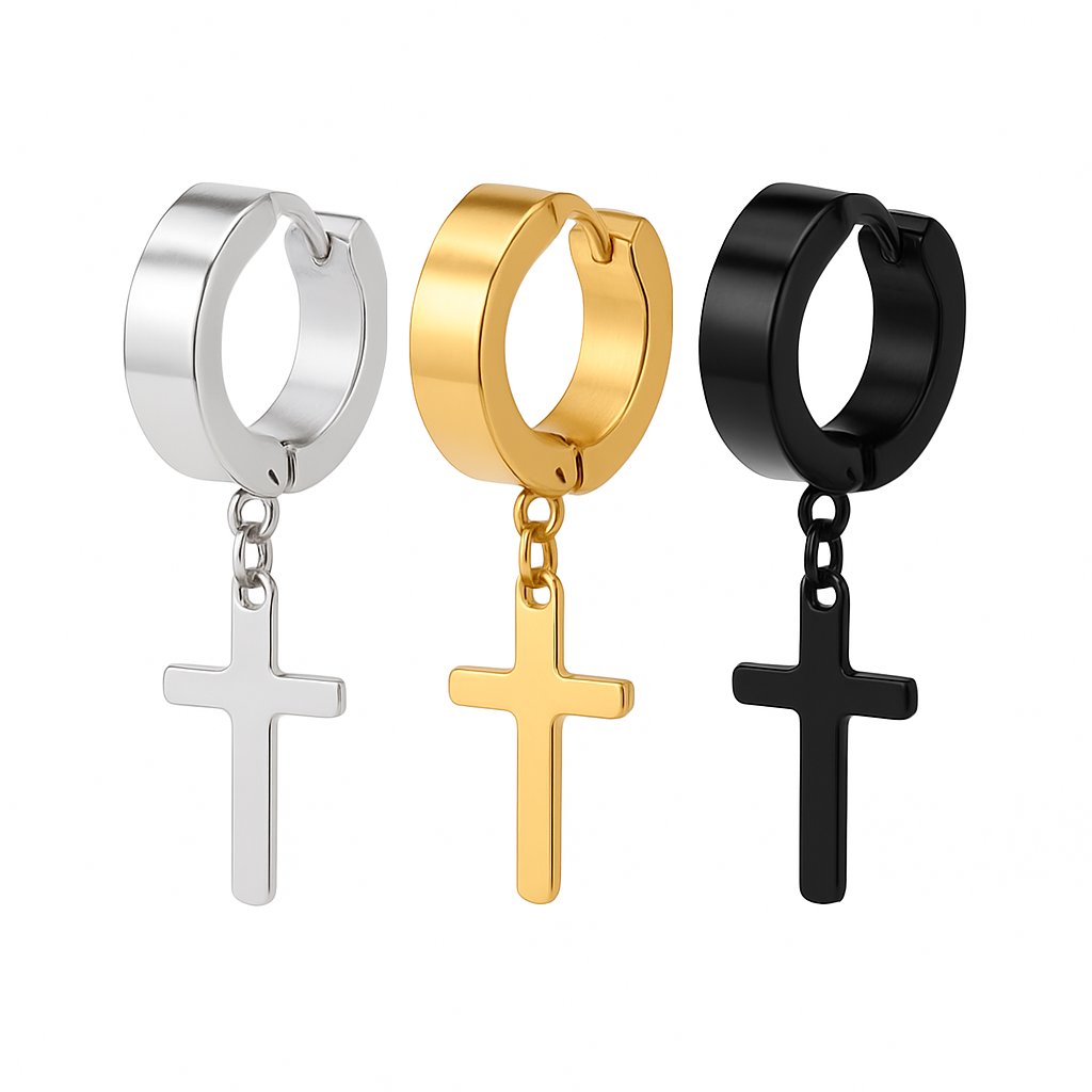 Tyto moderní náušnice s přívěskem křížku jsou vyrobené z kvalitní chirurgické oceli, která je odolná vůči poškrábání a zaručuje dlouhou životnost i při každodenním nošení. Minimalistický design v kombinaci s lesklým povrchem dodává náušnicím elegantní a výrazný styl, který se hodí jak pro ženy, tak pro muže.