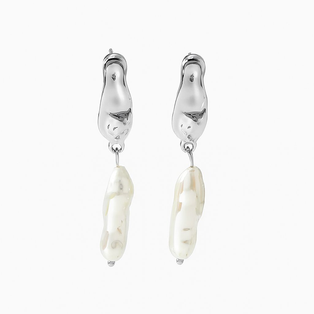 Dopřejte si originální kousek, který zaujme na první pohled. Tyto visací náušnice kombinují kreativní design s elegantními prvky – lesklý povrch ve stříbrném tónu a výrazné syntetické perly v přírodní úpravě. Nepravidelný tvar přidává šperku umělecký nádech a činí z něj ideální doplněk pro moderní ženu, která chce vyniknout.