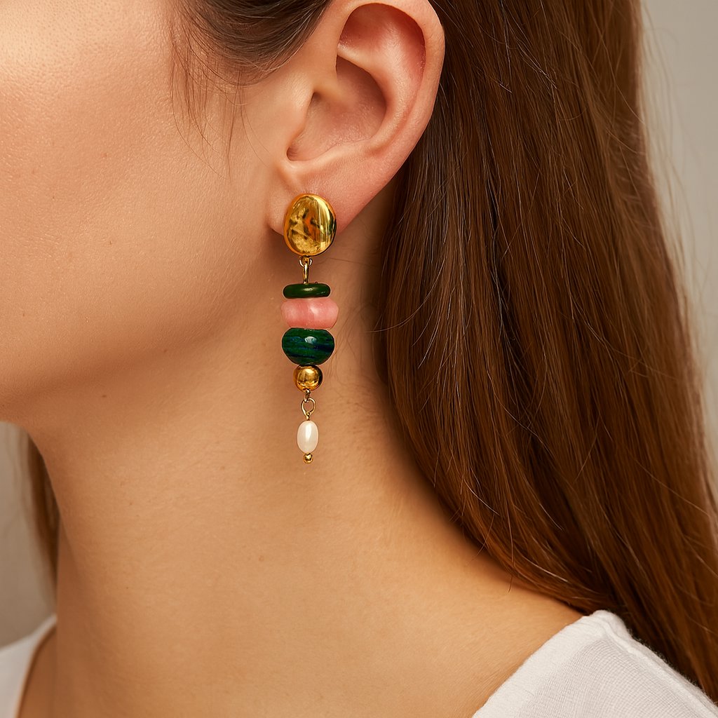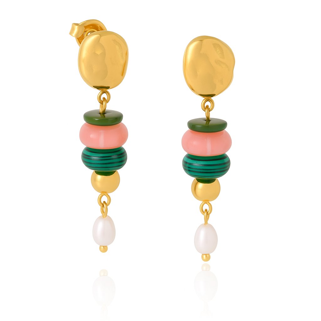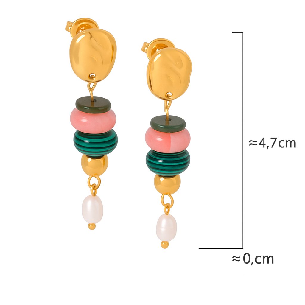 Tyto originální visací náušnice vynikají svým barevným kontrastem a organickým designem. Vrchní část tvoří lesklý zlatý prvek nepravidelného tvaru, pod kterým se houpají korálky v růžové, zelené a bílé barvě. Poslední korálek připomíná perličku a dodává náušnicím elegantní tečku. Perfektní volba pro ženy, které se nebojí vystoupit z davu.
