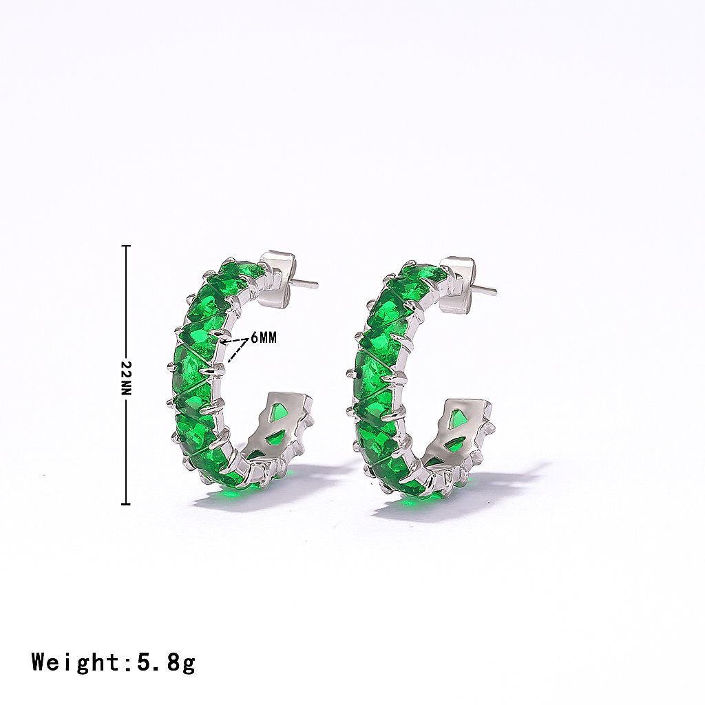 Náušnice jsou nepřehlédnutelným doplňkem, který v sobě spojuje eleganci, barvu a streetwearovou dravost. Jejich C tvar o průměru 22 mm je osazen řadou zelených zirkonů ve výrazném brusu, které dokonale odrážejí světlo a vytvářejí oslnivý efekt při každém pohybu.