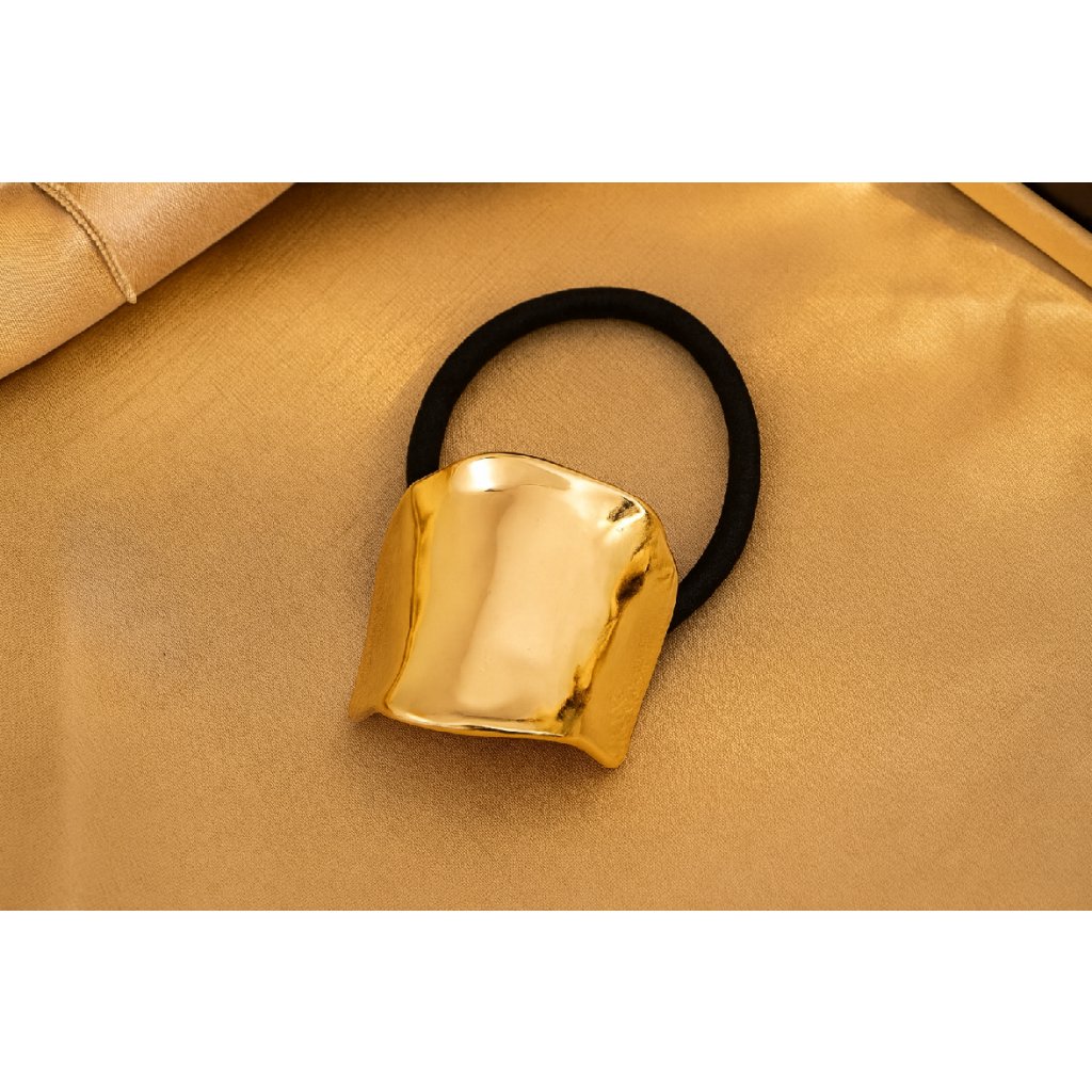 Dodejte svému účesu jedinečný šmrnc s touto designovou gumičkou do vlasů. Dominantní zlatý kovový prvek přitáhne pozornost a udělá i z jednoduchého culíku stylový prvek. Skvěle drží, netahá vlasy a hodí se jak na běžné nošení, tak na večerní příležitosti.