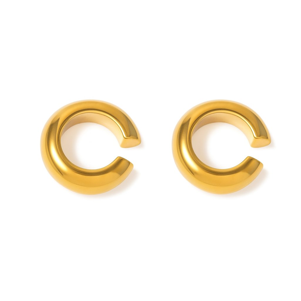 Tyto zlaté earcuffy z chirurgické oceli zaujmou svou hladkou linií a nadčasovým tvarem. Díky snadnému nasazení bez nutnosti piercingu jsou ideální volbou pro každého, kdo chce ozvláštnit svůj vzhled. Earcuffy skvěle drží na uchu a díky hypoalergennímu materiálu nezpůsobují podráždění ani při celodenním nošení.