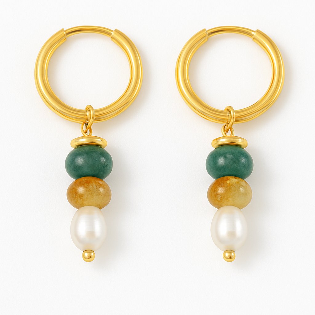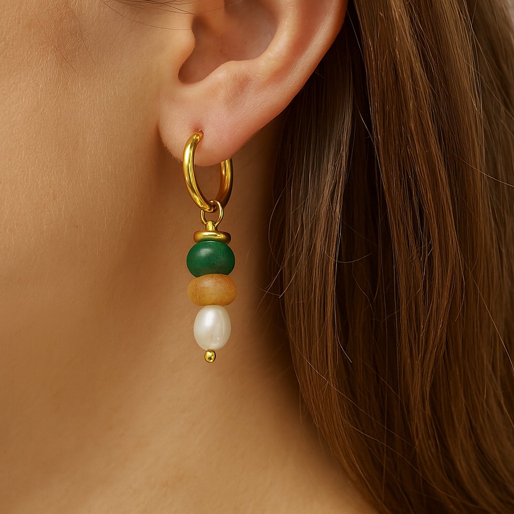 Tyto výrazné kruhové náušnice spojují eleganci a přírodní šarm. Každý pár je zdoben třemi korálky v odstínech zelené, medově hnědé a zlaté, doplněnými oválnou bílou perlou. Náušnice jsou zavěšeny na pevných zlatých kruzích, které dodávají celkovému vzhledu moderní a luxusní dojem. Skvěle doplní jak každodenní outfit, tak slavnostní příležitosti.
