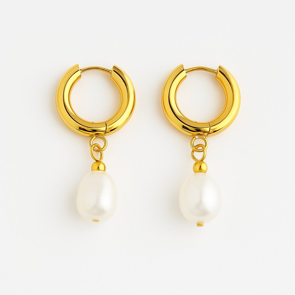Stylové kruhové náušnice, které kombinují moderní eleganci a jemný nádech luxusu. Zavěšené bílé perly o velikosti cca 9 × 7 mm dodávají šperku sofistikovaný vzhled, zatímco zlatý povrch kruhů působí decentně, ale výrazně. Náušnice jsou lehké a pohodlné na nošení, ideální pro každodenní použití i slavnostní chvíle. Vyrobeno z kvalitní chirurgické oceli s pozlacením pro dlouhotrvající lesk.