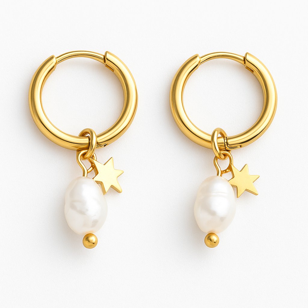 Elegantní kruhové náušnice ve zlaté barvě jsou ozdobené nepravidelnou bílou perlou a malým přívěskem ve tvaru hvězdičky. Díky kombinaci zlatého tónu a perly působí náušnice jemně, ale zároveň originálně. Ideální doplněk pro romantické duše i milovnice minimalismu se špetkou hravosti.