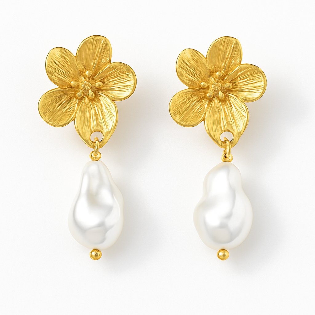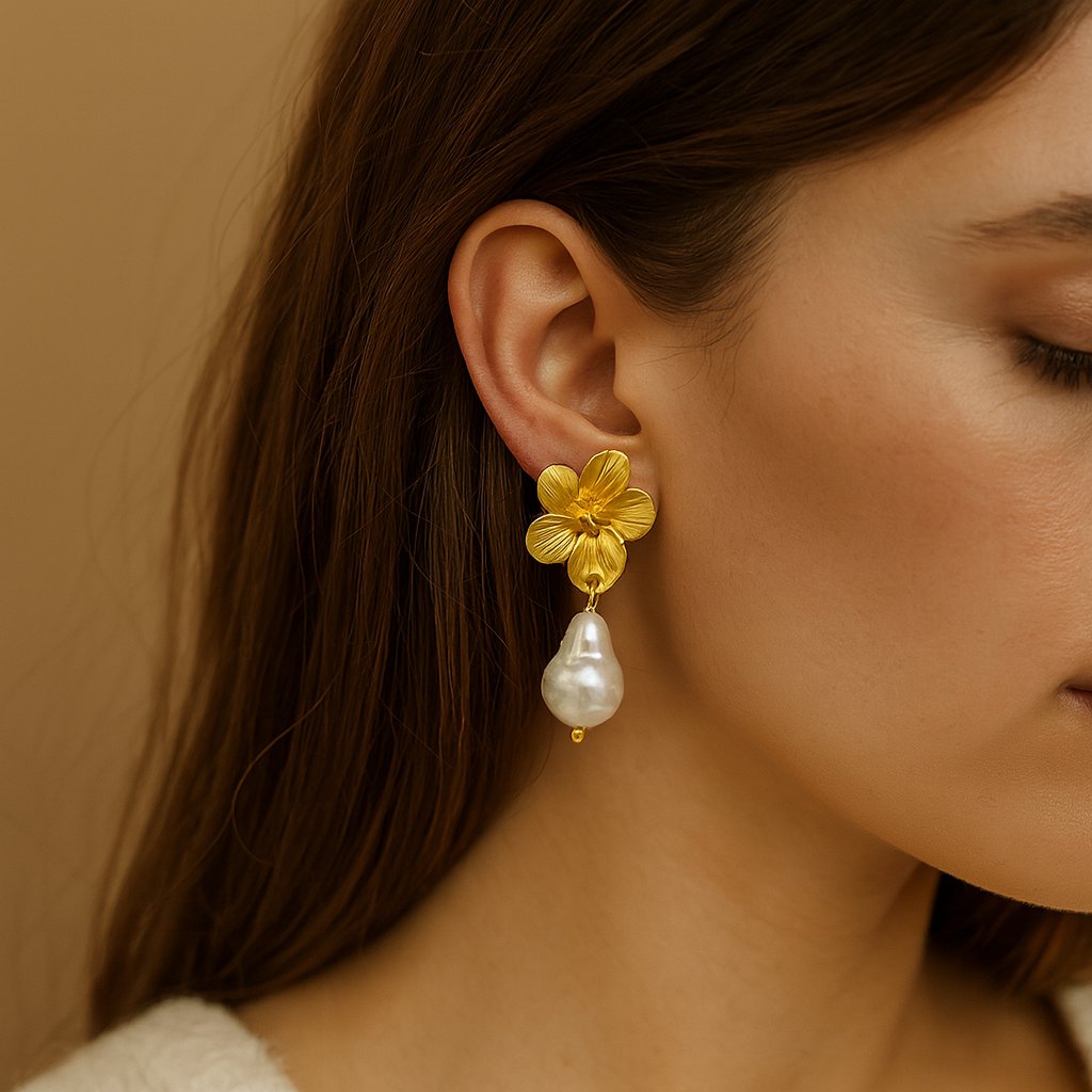 Tyto jedinečné náušnice ve zlatém tónu spojují něžný květinový design s nepravidelnými perlami, které připomínají barokní styl. Každá perla je originální, což dodává náušnicím osobitý šarm. Květy mají jemně strukturovaný povrch, který podtrhuje jejich přirozený vzhled. Náušnice jsou ideální volbou pro romantické příležitosti i každodenní nošení.