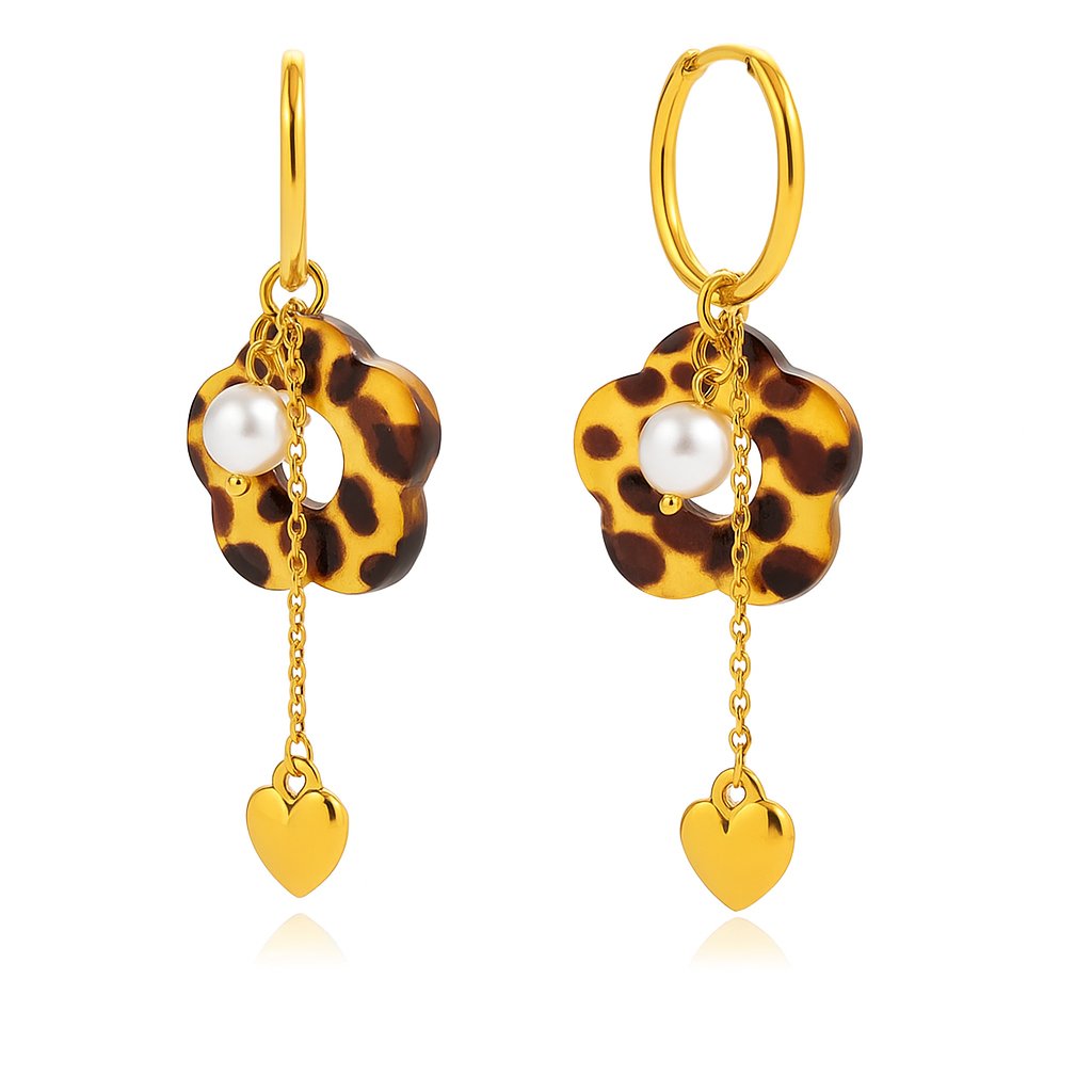 Tyto nepřehlédnutelné náušnice kombinují několik efektních prvků – leopardí vzor v květinovém tvaru, decentní perlu a visící zlaté srdíčko. Jsou lehké, voděodolné a hypoalergenní. Díky poutavému designu se skvěle hodí jako módní statement k outfitu, který si žádá pozornost.