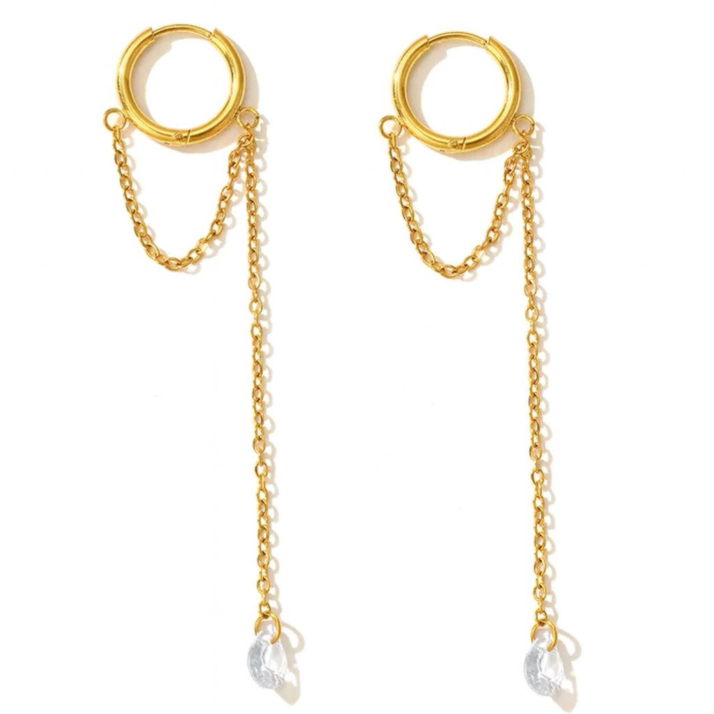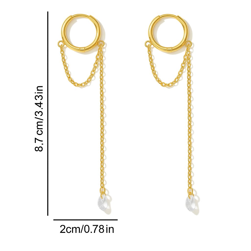 Elegantní kruhové náušnice ve zlatém provedení jsou ozdobeny dvojitým jemným řetízkem, který volně splývá a je zakončen broušeným zirkonem. Díky svému minimalistickému a zároveň výraznému vzhledu jsou ideální pro moderní ženy, které milují detaily. Skvěle se hodí k dennímu outfitu i k večerním šatům.