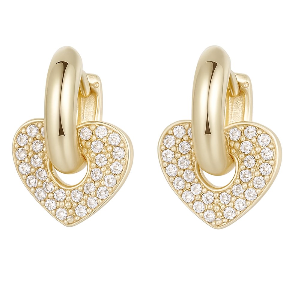 Elegantní náušnice ve zlatém tónu se zavěšeným srdcem posetým jemnými zirkony jsou symbolem lásky, odvahy a sebevědomí. Jemný třpyt a sofistikovaný tvar z nich dělají ideální volbu pro romantické duše i pro ty, které chtějí zazářit.