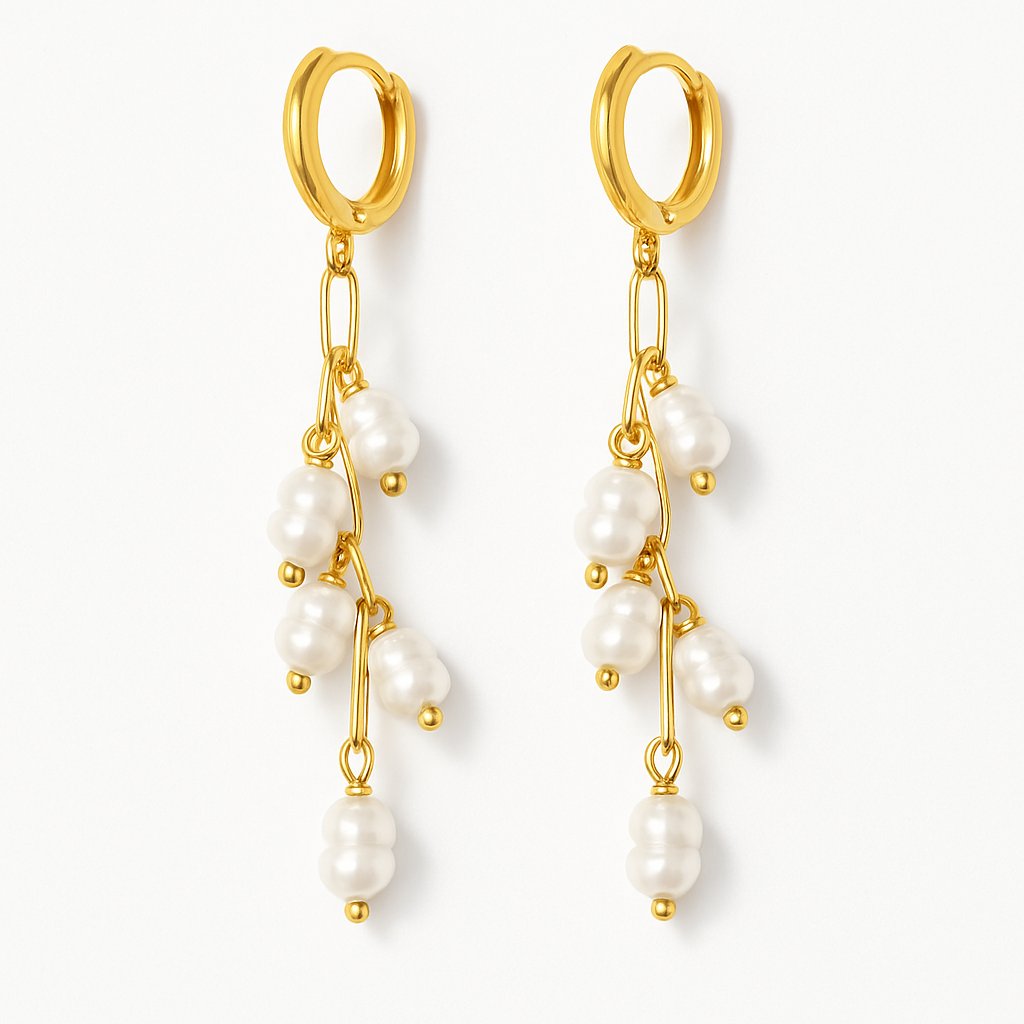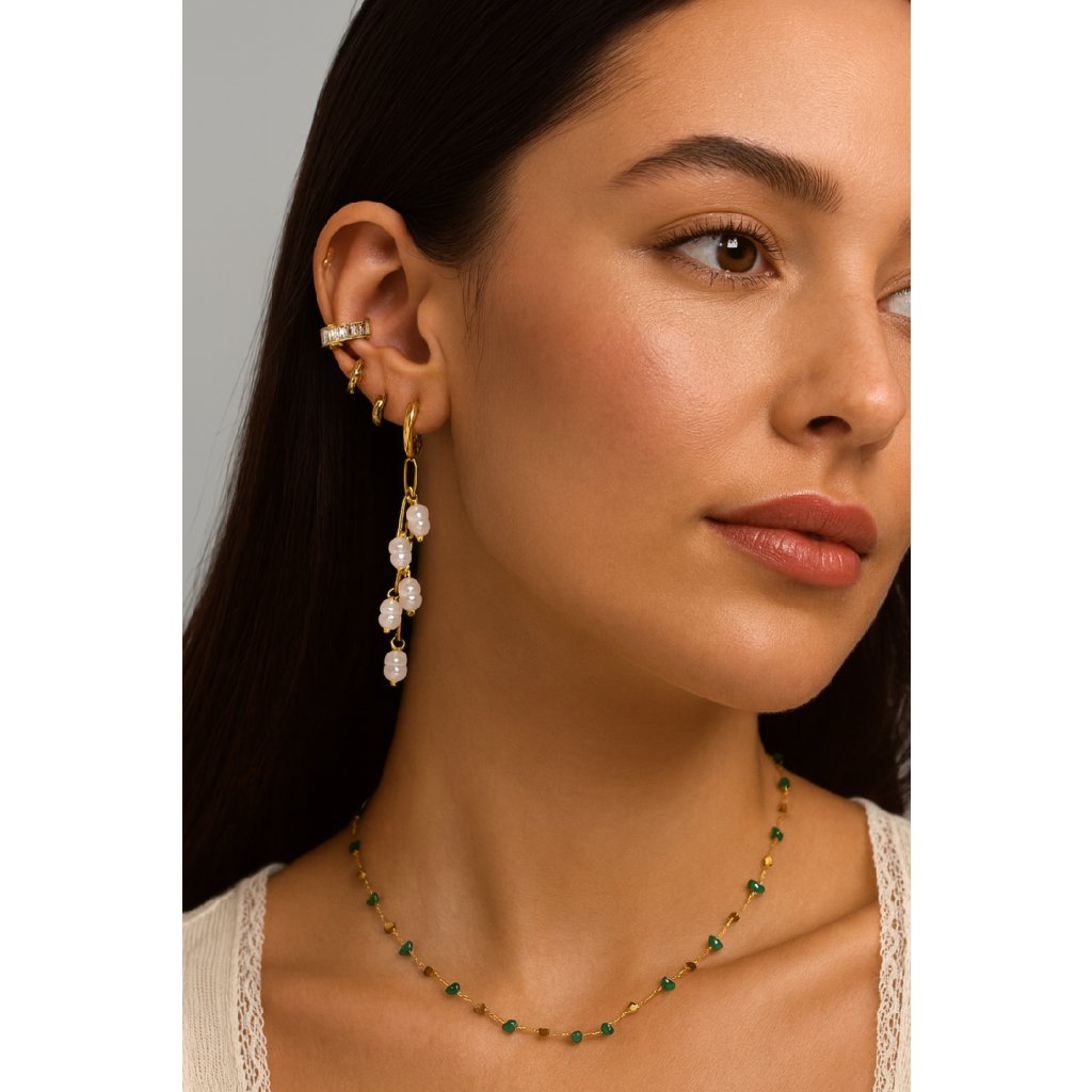 Tyto jedinečné visací náušnice kombinují moderní zlatý článkový řetízek s nepravidelnými perlami, které vytvářejí jemný a zároveň poutavý detail. Náušnice jsou ideální pro elegantní i ležérní outfity a dodají každému looku stylový nádech.