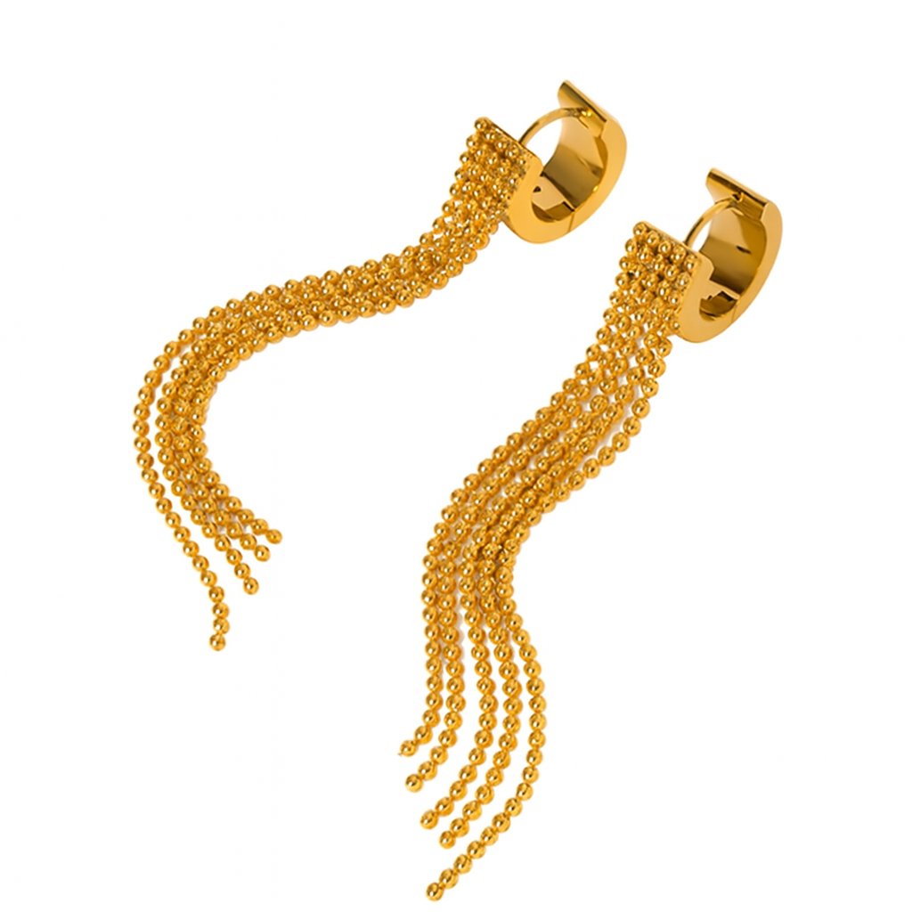 Zaujměte na první pohled s těmito výraznými visacími náušnicemi ve zlatém tónu, které tvoří jemné řetízkové pramínky. Jejich délka a dynamický pohyb při nošení přidávají na eleganci a ženskosti. Náušnice jsou vyrobeny z kvalitní chirurgické oceli, která je hypoalergenní, odolná proti vodě a vhodná i pro citlivé uši. Perfektní volba na večírek, slavnostní událost i jako stylový doplněk k minimalistickému outfitu.