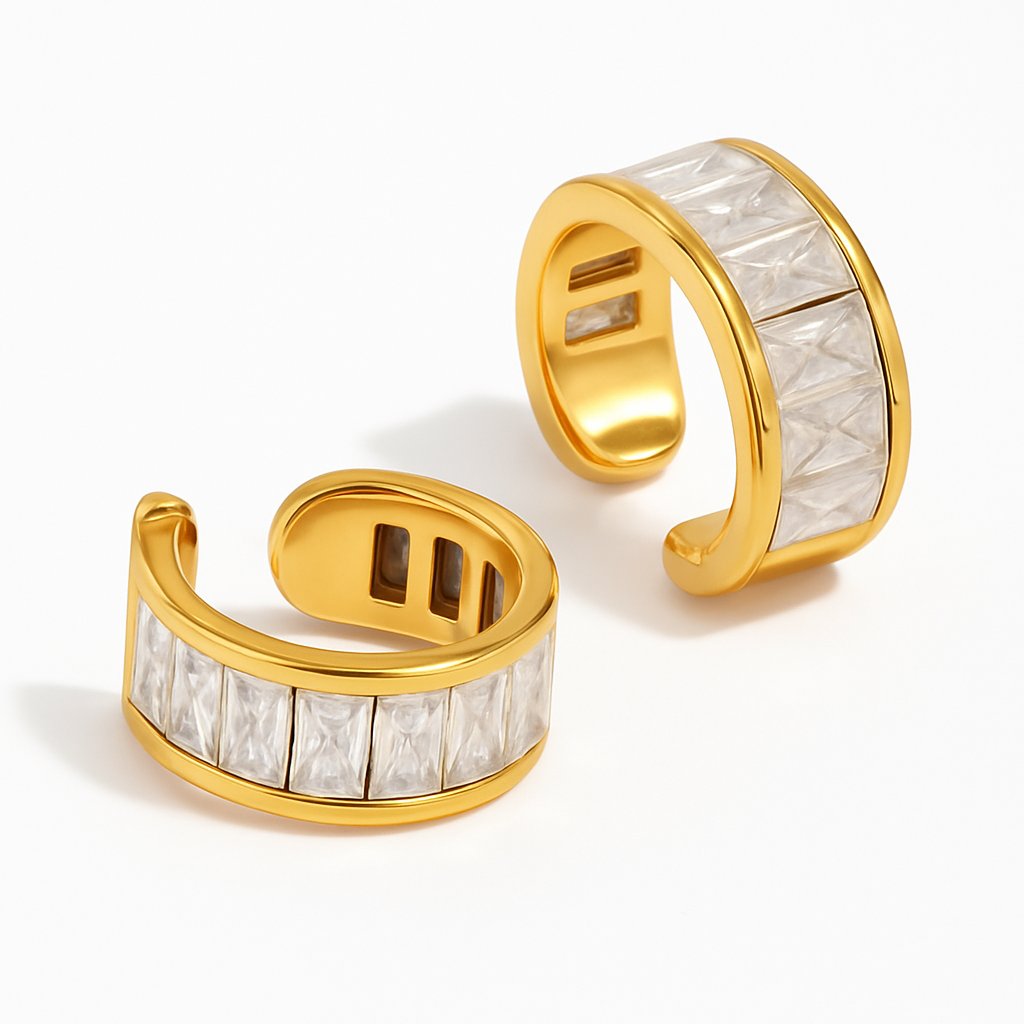 Tento pár stylových earcuffů dodá vašemu outfitu ten správný šmrnc. Earcuffy nevyžadují propíchnuté uši, jednoduše se nasadí na ušní chrupavku. Kombinace zlaté barvy a vsazených čirých zirkonů vytváří luxusní dojem, vhodný pro každodenní nošení i slavnostní příležitosti.