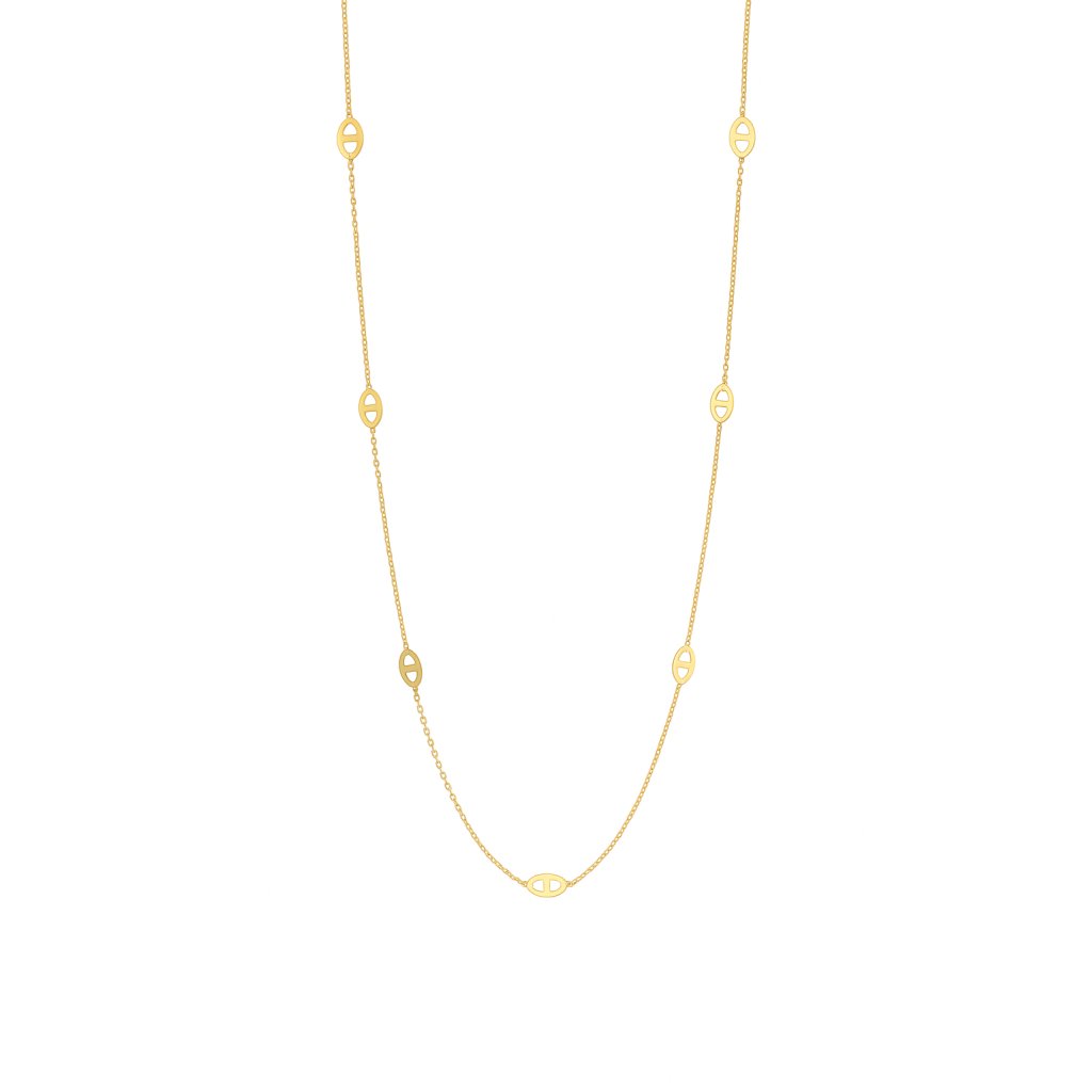 Tento elegantní náhrdelník je tvořen jemným řetízkem zdobeným pravidelně rozmístěnými oválnými články s výřezem. Nadčasový design v kombinaci se zlatou barvou z něj dělá ideální doplněk pro každodenní nošení i speciální příležitosti. Díky svému lehkému a decentnímu vzhledu se skvěle kombinuje s dalšími šperky. Vyroben je z kvalitní chirurgické oceli, která zajišťuje vysokou odolnost a barevnou stálost.