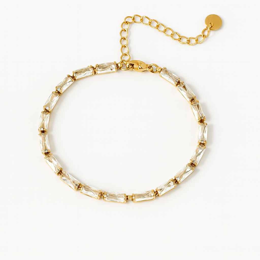 Luxusní a decentní náramek s obdélníkovými čirými zirkony zasazenými do zlatého kovového základu. Tento šperk je ideální volbou pro slavnostní příležitosti i jako jemný doplněk každodenního outfitu. Nastavitelná délka zajišťuje pohodlné nošení pro každé zápěstí.