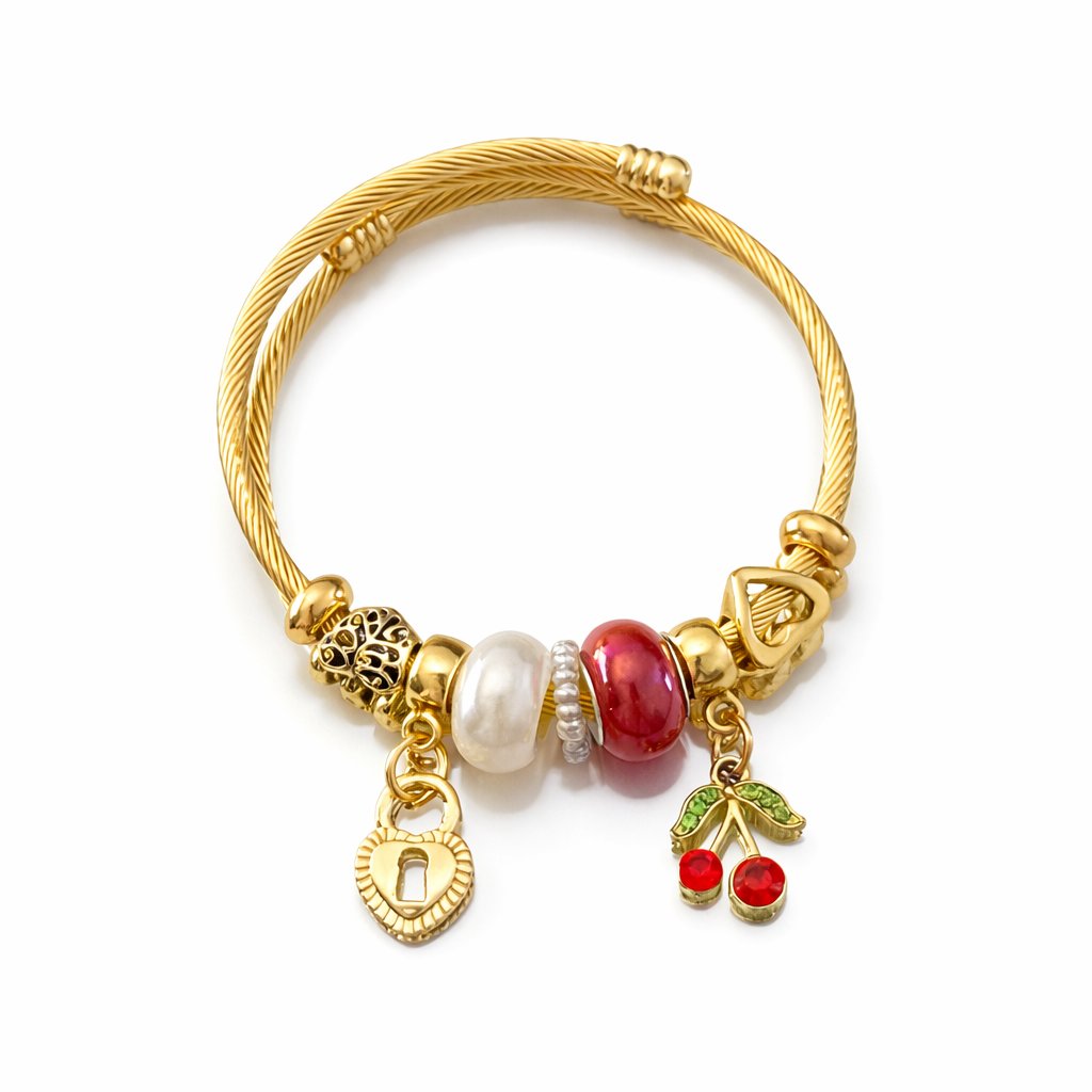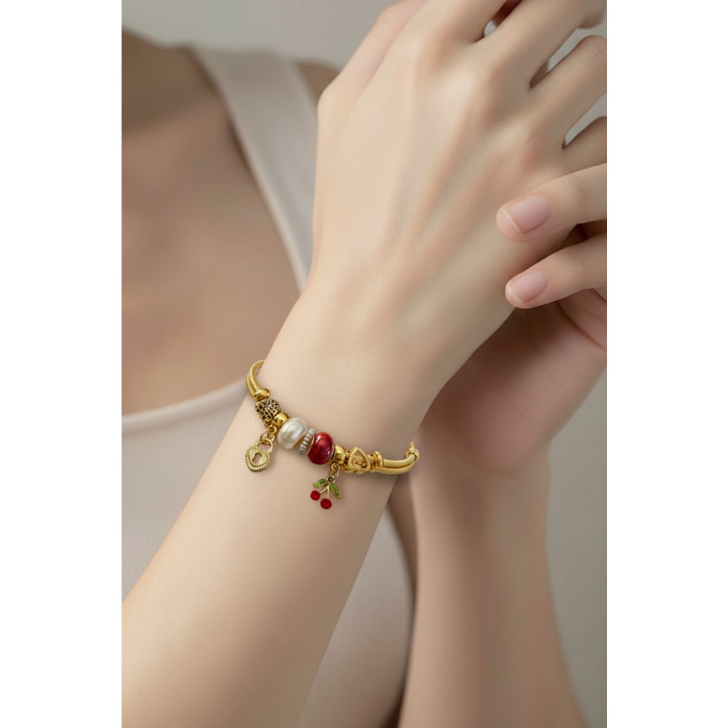 Tento zlatý náramek zaujme kombinací jemného kovového lanka, elegantních korálků a drobných přívěsků, které společně vytvářejí originální a přitom velmi ženský šperk. Perlový detail působí něžně a nadčasově, zatímco barevné přívěsky dodávají náramku hravý a svěží akcent.
