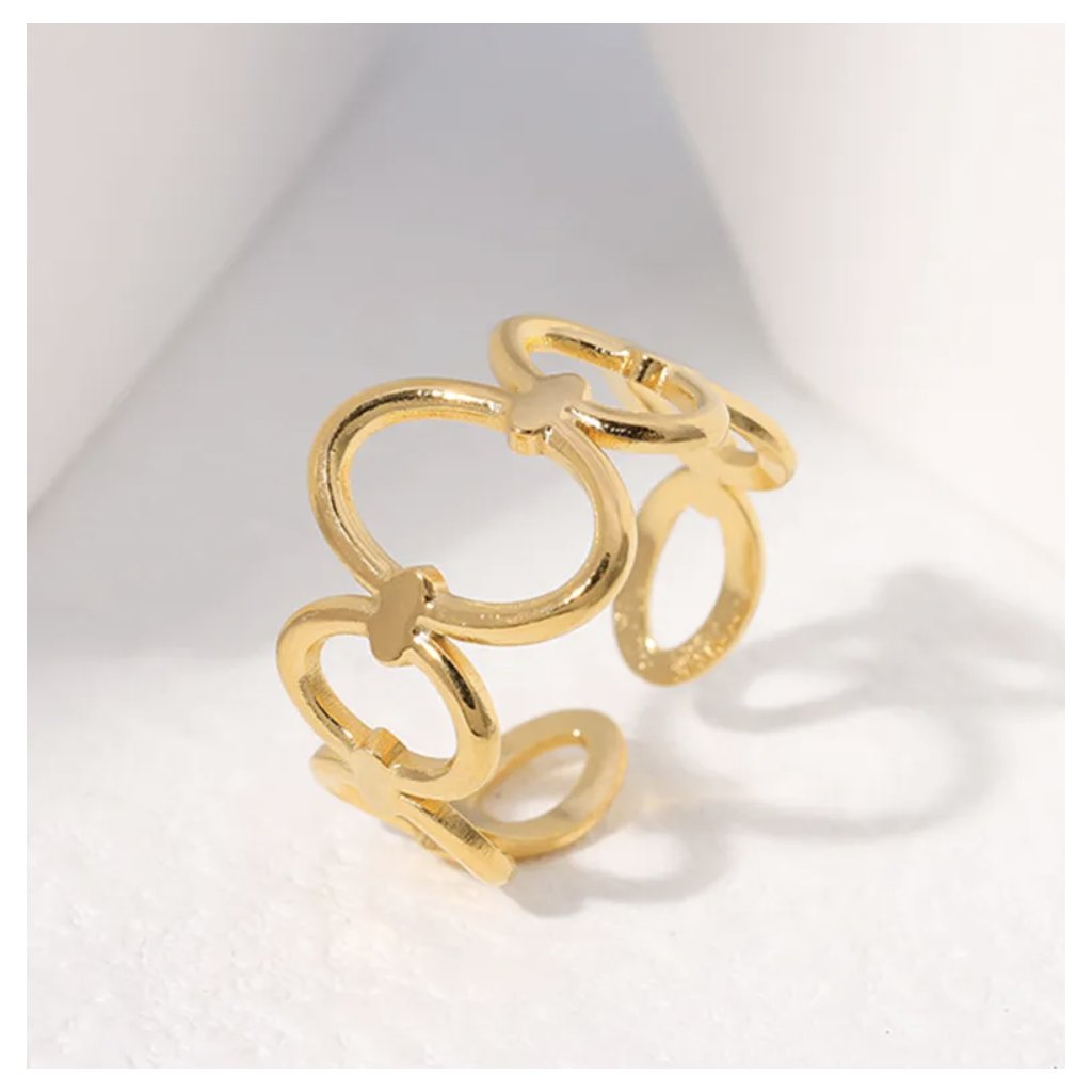 Stylový prsten s motivem oválných článků zaujme čistým designem a jemným leskem ve zlatém tónu. Otevřená konstrukce umožňuje pohodlné přizpůsobení velikosti prstu a zajišťuje komfort při nošení po celý den. Minimalistický vzhled se snadno kombinuje s dalšími šperky a dodá outfitu elegantní akcent.